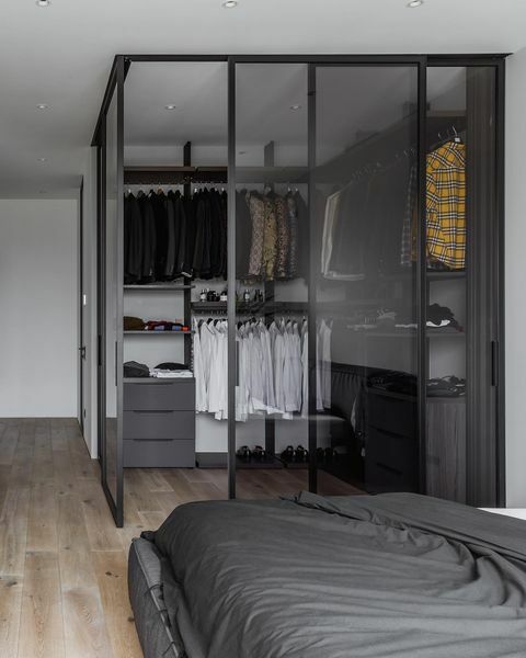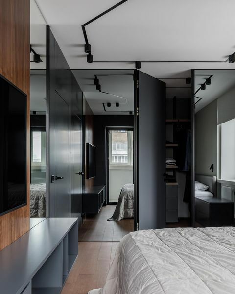 "Стеклянная гардеробная — это первое, что я согласовал со своим заказчиком, шоуменом, для которого наличие гардеробной было очевидной необходимостью. Идея была принята моментально и без правок. Раздвижные створки в этой системе Г-образной формы стыкуются углом, создавая эффект стеклянного куба. Стильный черный блок эффектно вписался в пространство спальни, став доминантой в интерьере".