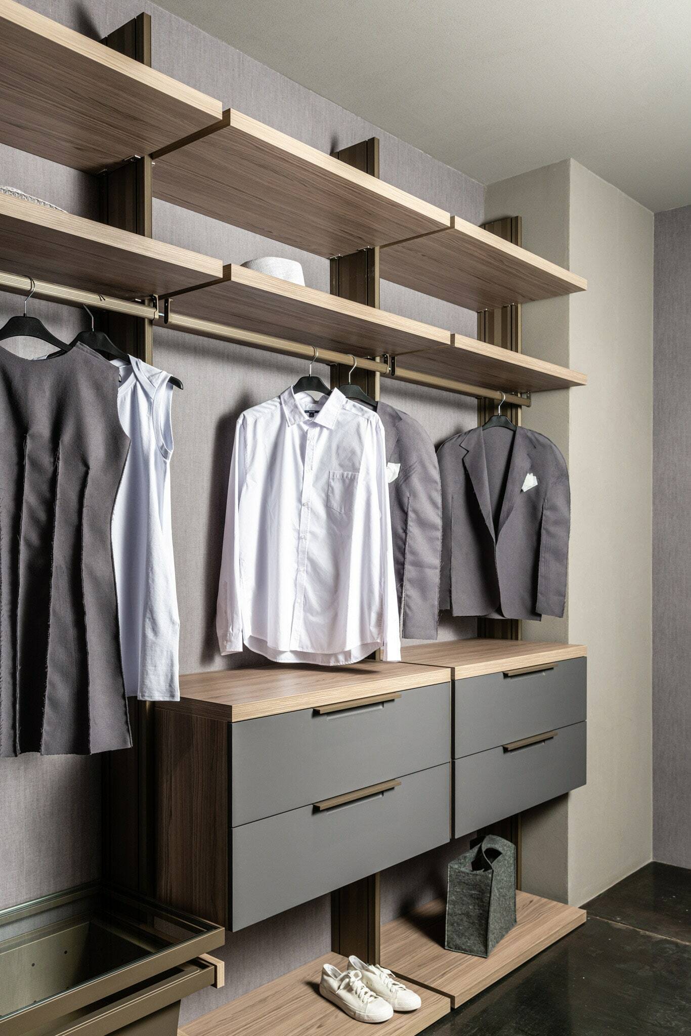 - В нижней зоне (60 см и ниже) организуйте пространство для хранения обуви, аксессуаров, а также редко используемой одежды.