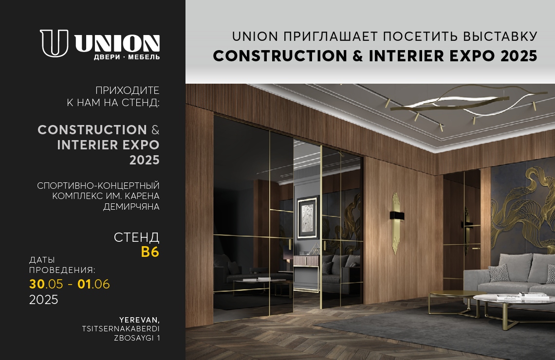 Компания UNION, лидер рынка производства дверей и мебели, приглашает вас посетить наш стенд на выставке Construction & Interier Expo 2025 в спортивно-концертном комплексе им. Карена Демирчяна с 30 мая по 1 июня (стенд В6). Концепция UNION "Двери и мебель в едином стиле" предоставляет всему дизайнерскому сообществу возможность воплощения любых проектов в стилистической целостности всех элементов интерьера: высококачественные двери, стеновые панели, раздвижные и складные двери и перегородки, гардеробные, шкафы, витрины, стеллажи, столы, полки и другая премиальная мебель. Уже более 35 лет UNION в сотрудничестве с итальянскими архитекторами производит изделия безупречного качества и современного дизайна, которые украсят любое пространство. Наш модельный ряд разработан на основе передовых технологий и инновационных решений, запатентованных UNION.Приходите и ознакомьтесь с нашими креативными идеями и новыми продуктами на Международной выставке Construction & Interier Expo 2025. | | | | |
